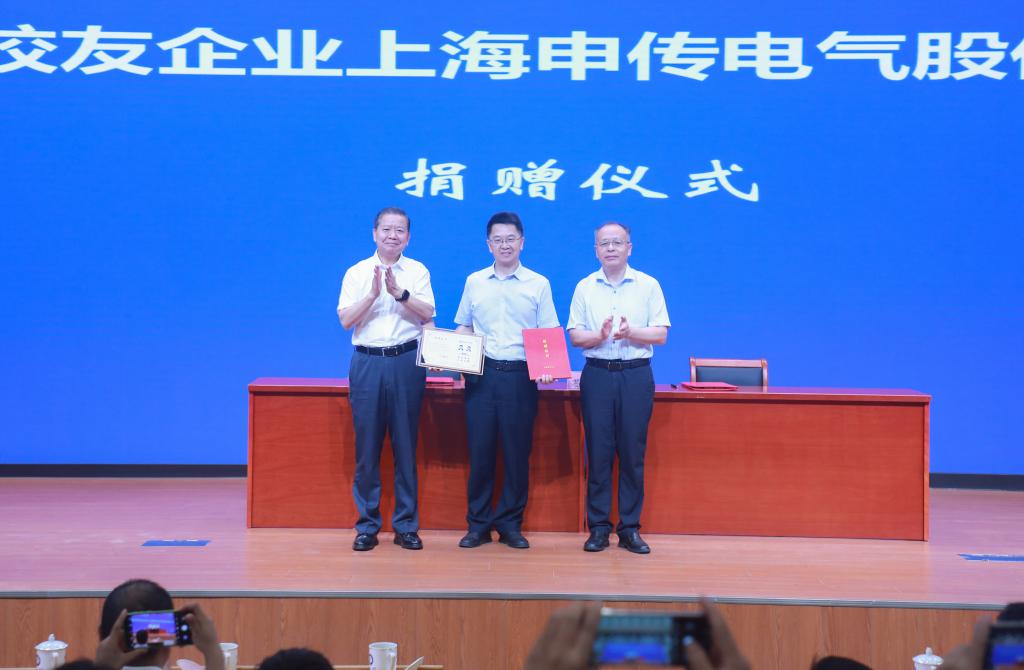 在郭永存、袁亮、郑昌陆的见证下,王先江代表学校与上海申传电气股份有限公司代表、技术总监郭勇签订捐赠协议。