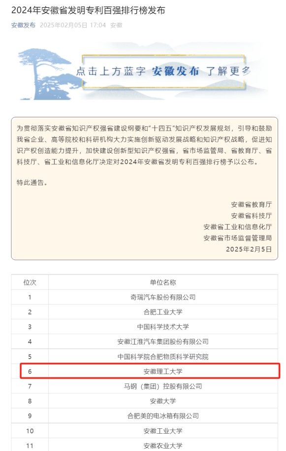 近日,安徽省教育厅、科技厅、工业和信息化厅、市场监督管理局联合发布了《2024年安徽省发明专利百强排行榜》。我校继2022年排名第8位,2023年排名第7位,2024年跃升至总排名的第6位,连续三年位居省属高校第一。