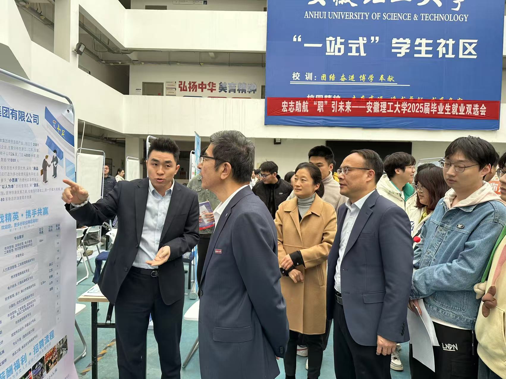 为深入学习贯彻党的二十届三中全会精神,全面落实党中央、国务院对高校毕业生就业工作的决策部署,持续为毕业生就业搭建平台,11月19日下午,学校在厚德馆大厅成功举办“宏志助航‘职’引未来——安徽理工大学2025届毕业生就业双选会”。校党委常委、副校长董雨到现场看望用人单位代表,详细了解招聘情况,询问用人单位对学校专业设置和人才培养等方面的意见建议。