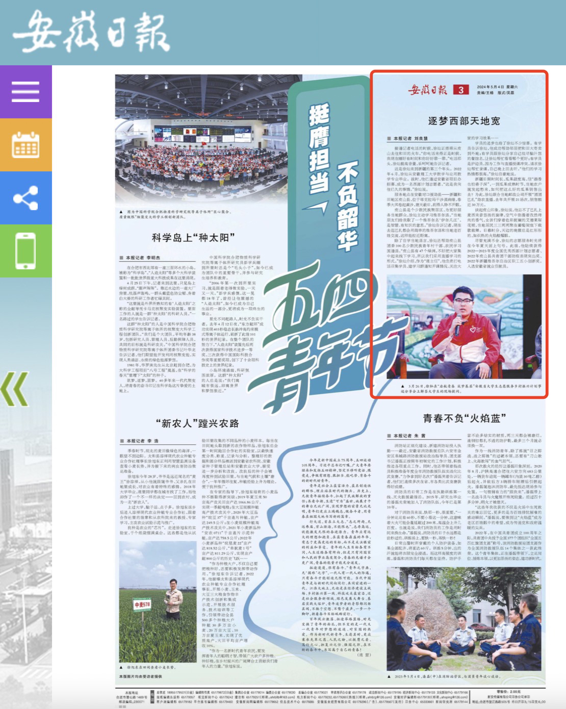 5月4日,安徽日报第3版以《逐梦西部天地宽》为题,报道了我校2022届服务西部计划志愿者徐灿扎根边疆、服务基层的先进事迹。全文如下: