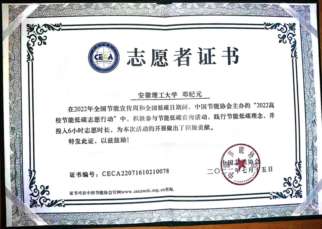 点点微光,汇入前路。由于家住农村,邓纪元早在小学时期就得到过来自社会各界的志愿者帮助。来到大学,他没有忘记这份善意,选择用行动来传递爱的奉献。大一刚开学,他便加入了学院的红十字志愿服务队,并在学校院系和党委的组织下,两次进行无偿献血;寒假疫情期间,邓纪元看到马路口抗疫志愿者的身影,不假思索就报了名,询问摸排卡点测温、秩序维护、信息登记、政策宣传…志愿工作一站就是一天,一做就是半个月。“手中拿的是体温枪,心里写的却是‘责任’二字。”敢为人先、认真负责的工作态度使社区工作人员对他印象深刻。截至目前,纪元已参与二十余次志愿服务,累计志愿时长 111小时。