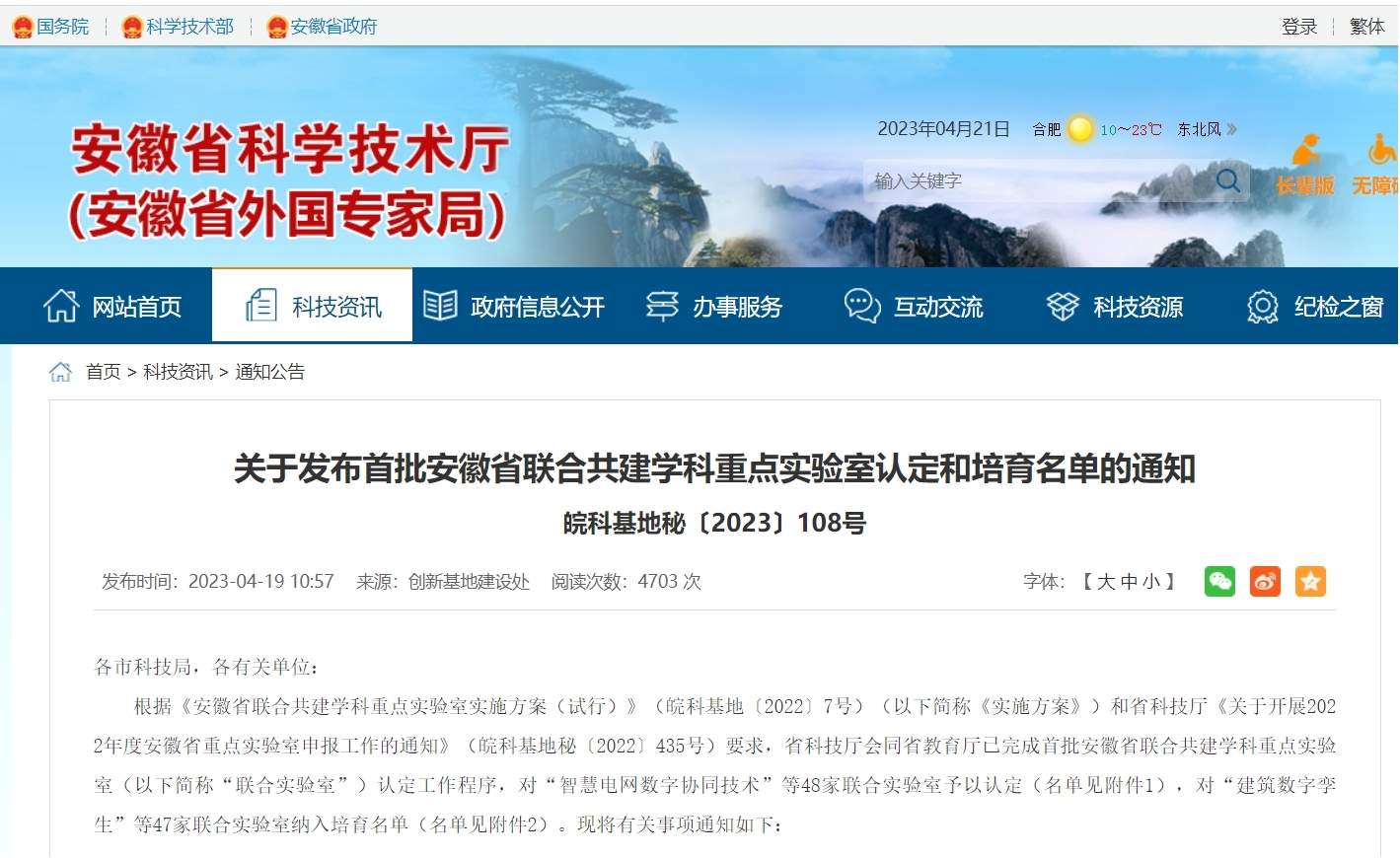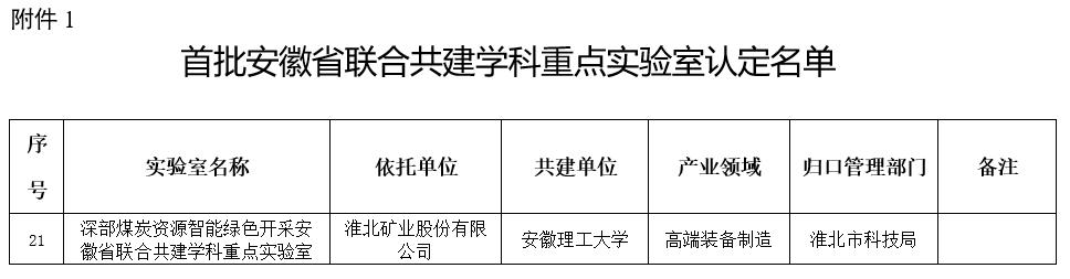 近日,安徽省科学技术厅会同教育厅联合下发了《关于发布首批安徽省联合共建学科重点实验室认定和培育名单的通知》(皖科基地秘〔2023〕108号),由安徽理工大学和淮北矿业股份有限公司联合申报的“深部煤炭资源智能绿色开采安徽省联合共建学科重点实验室”成功入围首批安徽省联合共建学科重点实验室认定名单,该重点实验室属于“高端装备制造”产业领域。