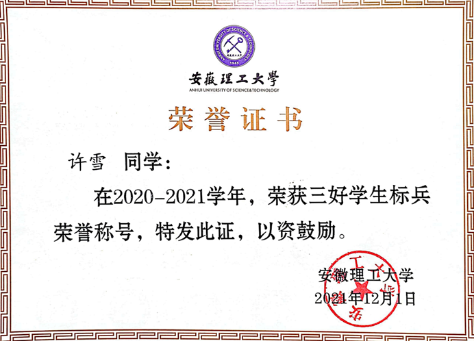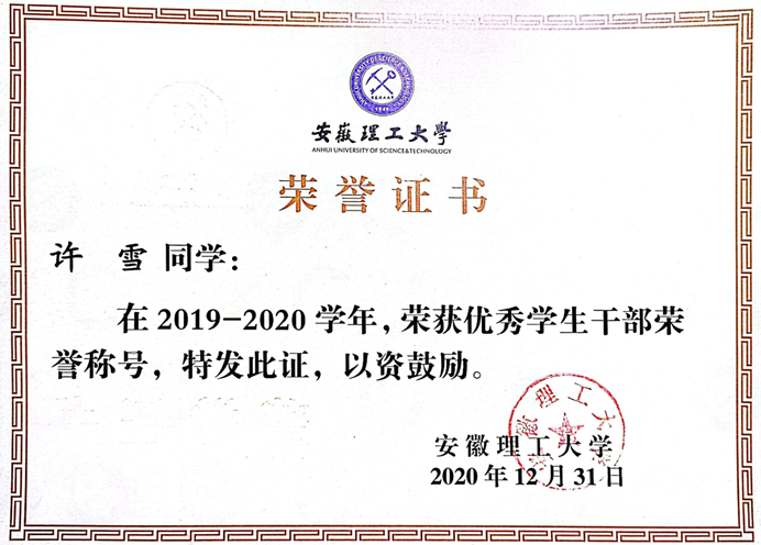 许雪,化学工程学院化学工程与工艺专业2019级学生。“宝剑锋从磨砺出,梅花香自苦寒来”,从刚步入大学的青涩女孩到如今的干练学姐,从迷茫到坚定,大学四年她一直不断突破自己,没有画地为牢,虚度光阴。生活并不是一帆风顺的,可是她就如雪中之梅一样,不畏风雪严寒,一点点绽开自己的独特之美。大学期间她以平均学分绩点4.156位列专业第一,在《现代工程制图与AUTO CAD》《线性代数》《生物化学》和《化工设计基础》等课程上取得95以上的高分。她曾三次获得校一等奖,获全国大学生化工实验大赛华东赛区特等奖和全国总决赛一等奖、全国大学生化工设计竞赛二等奖、全国“互联网+化学反应工程”课模设计大赛三等奖,以及“优秀学生干部标兵”“优秀共青团员标兵”“三好学生标兵”、校化学实验技能竞赛三等奖、校法律知识竞赛三等奖等一系列荣誉奖项。“青年如初春,如朝日,如百卉之萌动,如利刃之新发于硎,人生最宝贵之。”在这宝贵的大学时期,她不断地充实着自己,让自己创造出无限种可能。凭借着这股韧劲和拼搏的精神,她成功保研到天津大学化学工程专业攻读研究生。