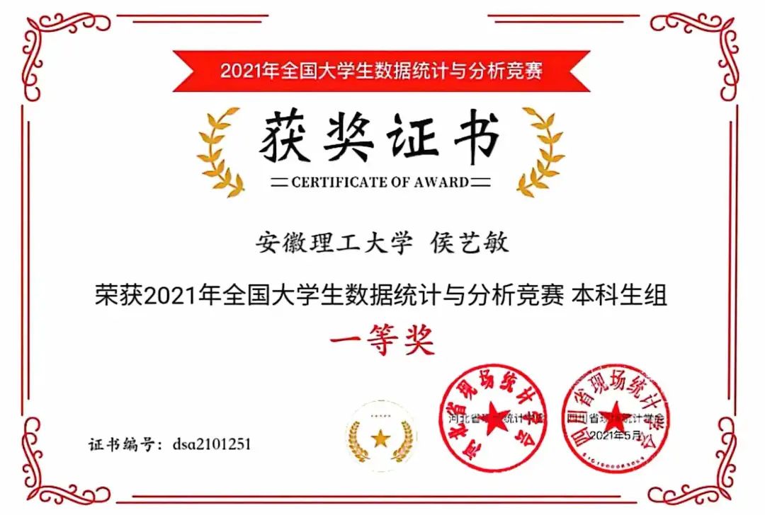 除了平时的学习,侯艺敏也主动投身各种比赛之间磨炼自己。2021年的全国大学生数学建模竞赛中,侯艺敏、徐毅豪和李策三人组成队伍,获得安徽省三等奖。作为各专业的优秀学子,本以为强强联手势必能创造一次辉煌战绩,但未曾想到在沟通交流方面出了岔子。由于每个人对比赛都有着个人独特的见解,造成意见的不统一。比赛结果令大家饱含遗憾。或许是受到转专业的影响,不同的作息时间,不同的生活习惯和学习方式,习惯了和周遭一切不同的侯艺敏习惯单打独斗。也正是这次的合作经历,让她明白了团队合作的重要性:只身一人的努力是脆弱的,就像漂流的鲁滨逊一样,只有同别人在一起,他才能完成自己的伟大事业。