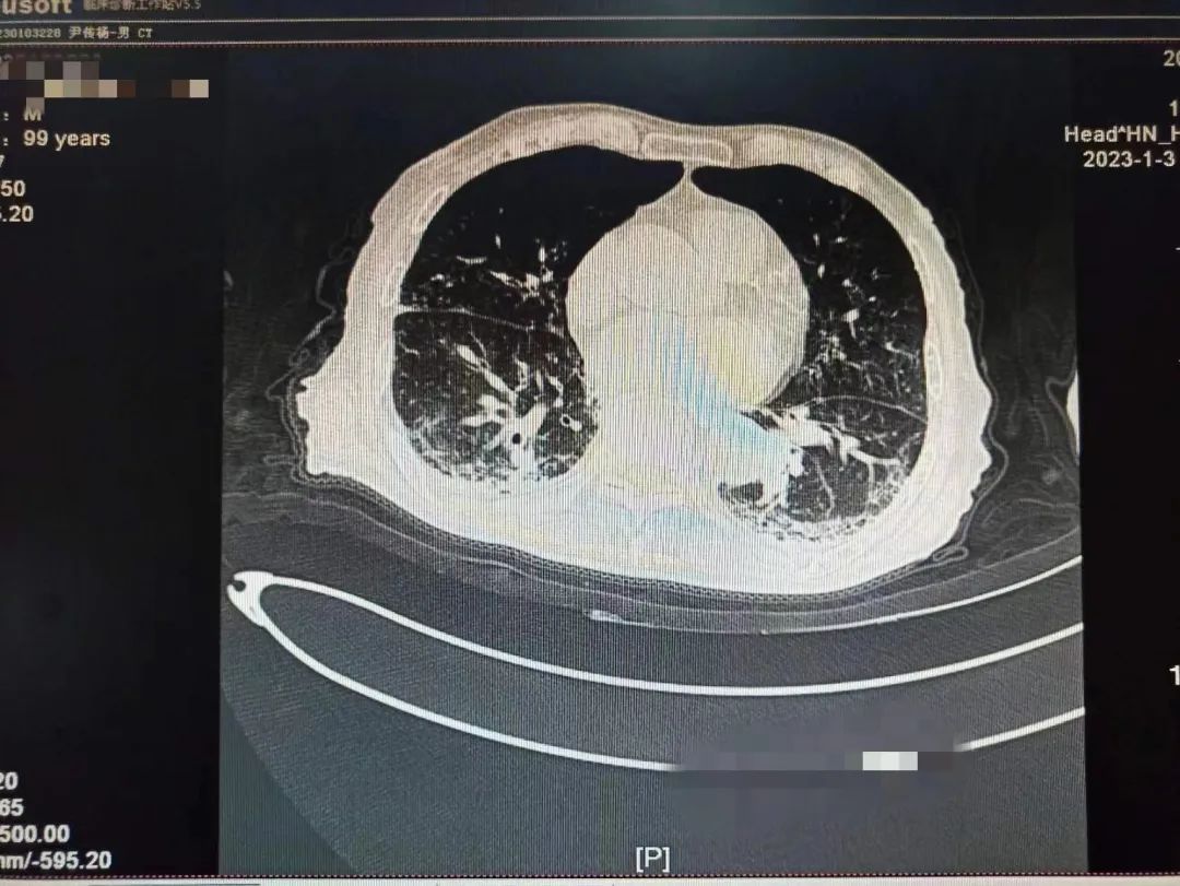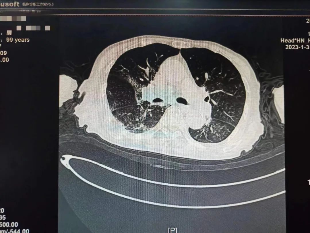 学校一附院呼吸与危重症医学科一名患者刘老爷子还差几天就到100岁生日,该患者从2022年12月22日开始持续发热,咳嗽。一开始只是以为普通的感冒,没特殊注意,后逐渐出现胸闷,乏力,精神差,在当地医院完善肺部CT,两肺大片病毒性肺炎表现,新冠核酸阳性,家属急送一附院就诊。