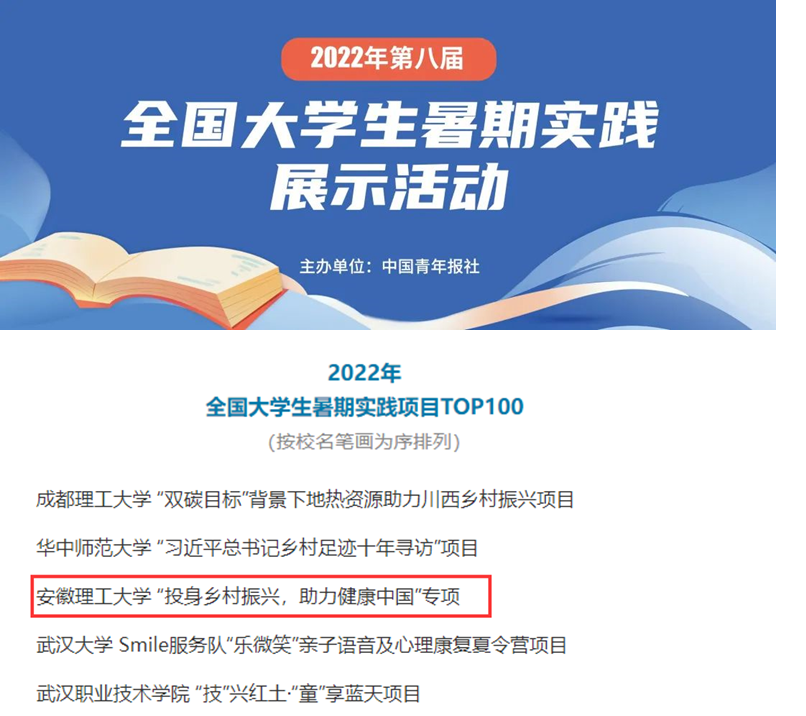 近日,由中国青年报社开展的“2022年第八届全国大学生暑期实践展示活动”评选结果出炉,经过高校推荐、团队自荐、网络展示等环节,我校医学院“投身乡村振兴,助力健康中国”项目,从全国数百所高校的3000多个项目中脱颖而出,成功入选“全国大学生暑期实践项目TOP100”。