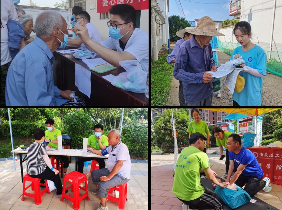 今年暑期,在校团委指导下,医学院“投身乡村振兴,助力健康中国”全国专项社会实践团,秉承“健康中国”理念,联合校第一附属医院,立足淮南市就近就便开展专家义诊义检、卫生健康知识宣讲、急救知识培训、医疗现状调研等志愿服务。临床医学专业学生志愿者深入我校乡村振兴定点帮扶村——新华村、汤王村,为村民进行眼部检查、健康咨询,现场教授急救技能,派发各类健康宣传手册和爱心医疗包。活动累计为当地150余名村民提供义诊义检服务,发放各类宣传单600份,收集调查问卷300份,发放常用防暑药品价值约5000元。医学类学生在为民服务中践行从医者的初心使命,在乡村振兴中彰显青年人的责任担当。