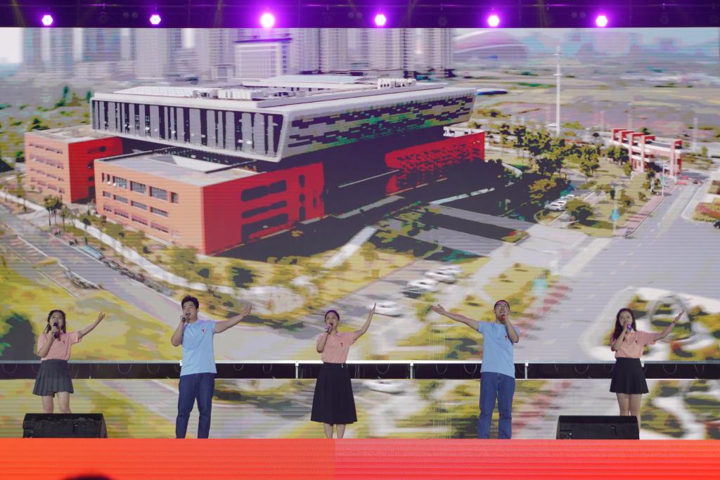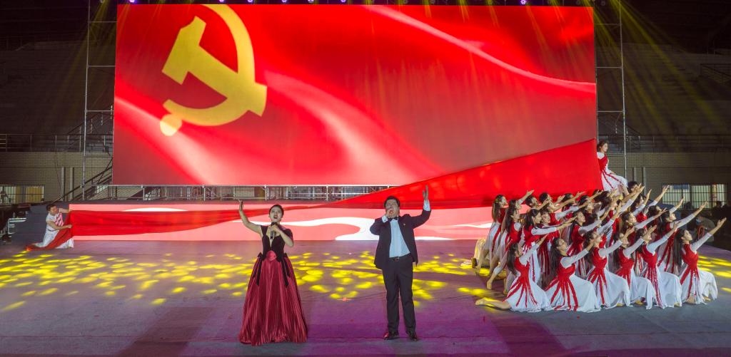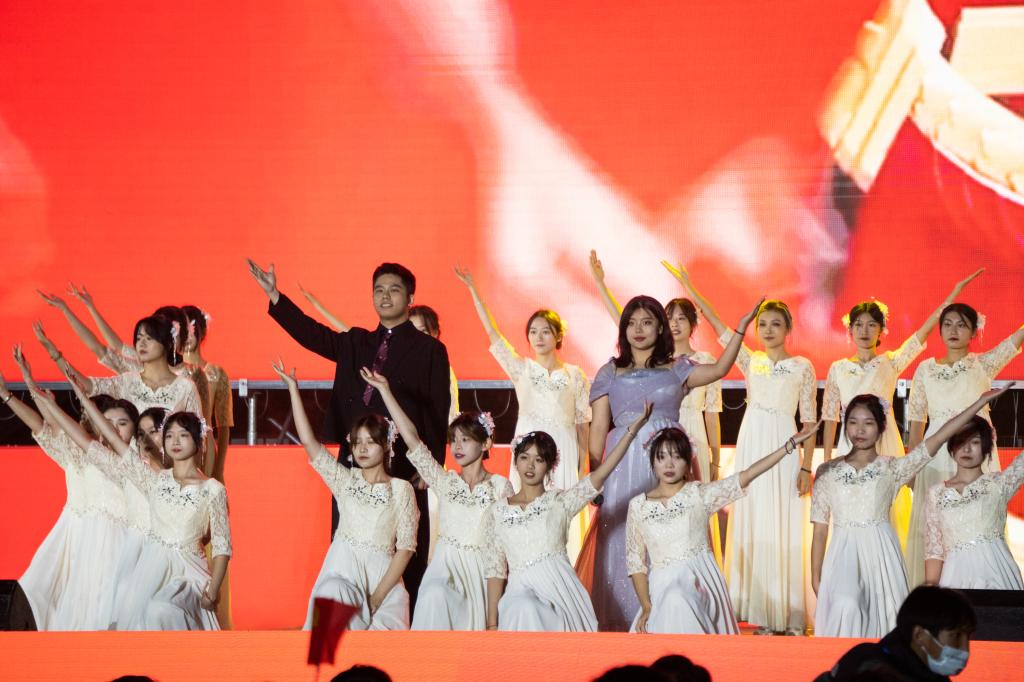 晚会聚焦党的十八大以来我国经济社会发展所取得的各项突出成就,围绕经济、政治、文化、社会和生态文明建设“五位一体”总体布局,以歌曲、舞蹈、器乐、情景剧等形式展现出一台精彩绝伦的艺术盛会与思政课堂。歌舞《时代感》开场燃动现场,青春的舞姿伴随着动感的旋律唱出了新时代新风范,舞出了新时代你我他;现代舞《星火永相传》以时空交错的表现形式将一代代航天科技工作者立志科技报国的感人故事搬上舞台,表达安理学子奋斗朝夕逐梦行、矢志投身国家重大工程的精神;歌舞情景表演《达拉崩吧(安理版)》是为2022级新同学量身定制的节目,歌手全新改编了歌词向全体新同学们“种草”校园里的美食美景和生活学习的经验,引起现场同学的强烈共鸣;2022级新生辅导员与新生合唱的歌曲《孤勇者》则掀起了全场热潮,新同学们勇敢表达青春的无畏与担当,现场万名同学齐声合唱,呼唤出开启大学征程的全新梦想;故事讲述《燃烧的雪花》由我校土木建筑学院宋恩周同学以北京冬奥会志愿者的身份分享了冬奥志愿者的点滴故事,诉说新时代中国青年胸怀天下的勇毅与决心、服务社会的奉献与担当;器乐演奏《山川和韵》以春夏秋冬四个季节为序,融合包含古人智慧的文化精髓“二十四节气”为切入,演奏出人与自然和谐共生的生态之美,大美中国青山绿水的锦绣画卷。“伟大的中国共产党,乘风破浪,扬帆远航,领航中国在新时代的征程上!”洪亮坚定的歌声气势磅礴、经久不息,晚会在歌舞《领航》中落下帷幕,全体师生起立,挥动着手中鲜红的党旗高声歌唱,唱出内心坚定不移听党话、跟党走,立志做有理想、敢担当、能吃苦、肯奋斗的新时代好青年的信念与决心!
