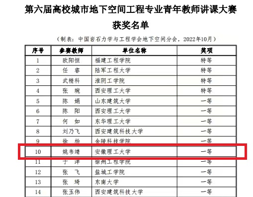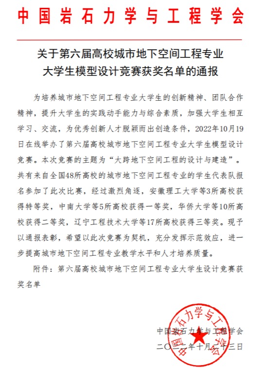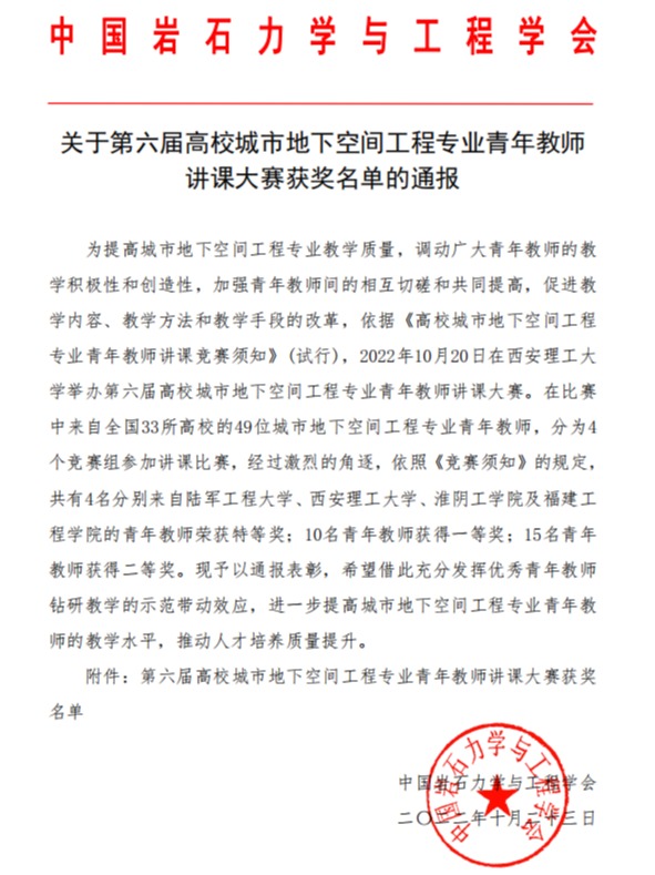 10月19日至20日,由中国岩石力学与工程学会主办,西安理工大学等单位承办的第六届高校城市地下空间工程专业青年教师讲课大赛和大学生模型竞赛在陕西西安举行(线上),我校师生在两项赛事中取得佳绩。