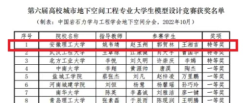 大学生模型竞赛中,来自西安理工大学、中南大学等48所高校的城市地下空间工程专业的学生代表队参加了此次大赛。经过激烈的角逐,我校土木建筑学院代表队“天穹”(成员:城市地空20-1班,赵玉州;城市地空20-1班,郭贺林;城市地空20-2班,王湘吉;指导教师:姚韦靖)荣获特等奖(第1名)。