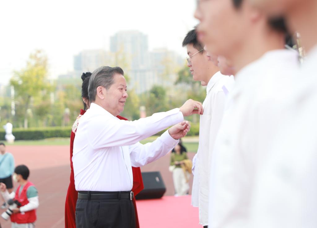 典礼上,袁亮为新生代表佩戴校徽。从佩戴上安徽理工大学徽章的那一刻起,标志着同学们成为了一名真正的“安理人”,也赋予了同学们新的责任与使命。