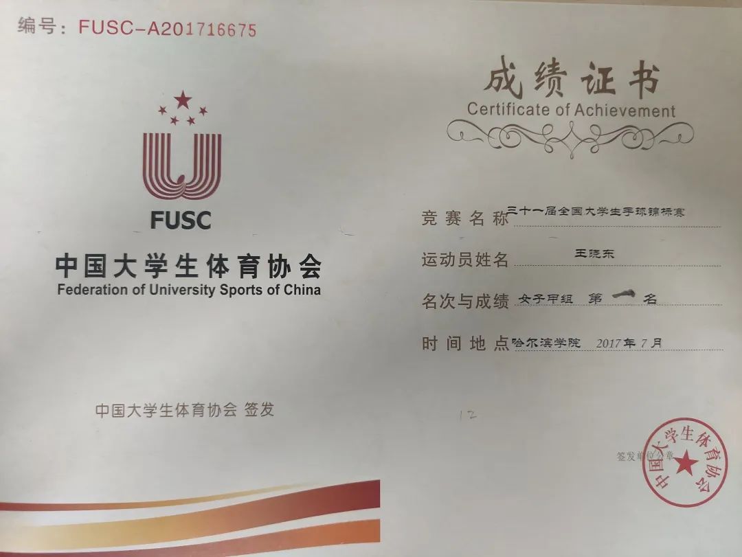 手球,是综合篮球和足球的特点而发展起来的一种用手打球、以球攻入对方球门得分的球类运动,相较于足球篮球而言更加激烈。当然,手球队的训练也十分辛苦。手球队平常会进行基础的体能训练,一周三四次,一次两三个小时,周末更是整个下午都是训练。从大一直到现在,王晓东一直坚持参与手球队的训练。手球比赛少不了肢体触碰,很多次比赛后王晓东的身上都是青一块紫一块的,但王晓东对此不甚在意,对她来说,能为手球队做出贡献是最重要最值得的事情。中国大学生手球锦标赛比赛时间通常在七月底,她们提前一个月就开始为比赛准备,炎炎烈日,仁爱操场上总是有她们拼搏的身影、撒下的热汗,是她们赤诚奋斗的见证。时间这位伟大的魔术师,从不辜负对拼搏者的允诺,从不吝啬对奋斗者的褒奖。她们连续四届获得中国大学生手球锦标赛女子甲组冠军!