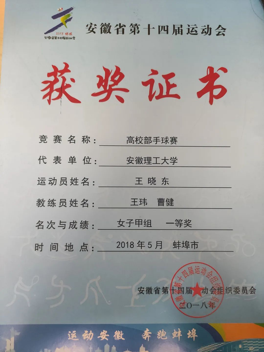 “晓东很安静,表面看上去都不像运动员。但是在球队训练中她展现了出众的身体素质,爆发力好,训练能吃苦,而且领悟能力强。于是我们就重点培养这个小姑娘。”这是韩惠教练对王晓东的评价。在不断地训练过程中,王晓东在手球队中的位置从边锋开始,后来学习打内锋,在今年安徽省第十五届运动会高校部手球比赛前一周,她被委任了组织这一位置。组织是一个团队的核心,需要把握全局,指挥队员打什么战术。王晓东告诉笔者:“手球是需要体力和脑力并存的运动,之前的比赛中一直有很厉害学姐带领,很有信心。而自己相比组织更擅长内锋,还是有很大压力的。”在这一周内,王晓东研究了很多战术,教练教授的,自己看比赛琢磨的,也经常组织队友一起商量,补足短板。准备上场时,意外又发生了,王晓东发现自己发烧了。王晓东带病上场,“在身体不适的情况下开场进了好几个球,直接把局面打开,队伍的气势立马就起来了!”王晓东的队友田慧敏激动地告诉我们,眼睛闪闪,满是敬佩和喜悦。顺境处之坦然,逆境处之泰然,也正是因为之前的脚踏实地,打下了好的基础,才能在逆境之中保持镇定,爆发实力。帮助球队赢得比赛的王晓东并没有自我骄傲,她感动也感谢教练和队友在比赛中对自己的关怀,也觉得幸好不辜负大家,不辜负手球队。在采访中,王晓东一直强调手球比赛是一个团队的配合协作。大三和大四的时候,王晓东成为学校手球队队长,她经常组织团建,联络队友感情,这让手球队的氛围很轻松温暖。即使有时出现失误,队友们从不会互相埋怨怪罪,而是一起解决,鼓励对方。