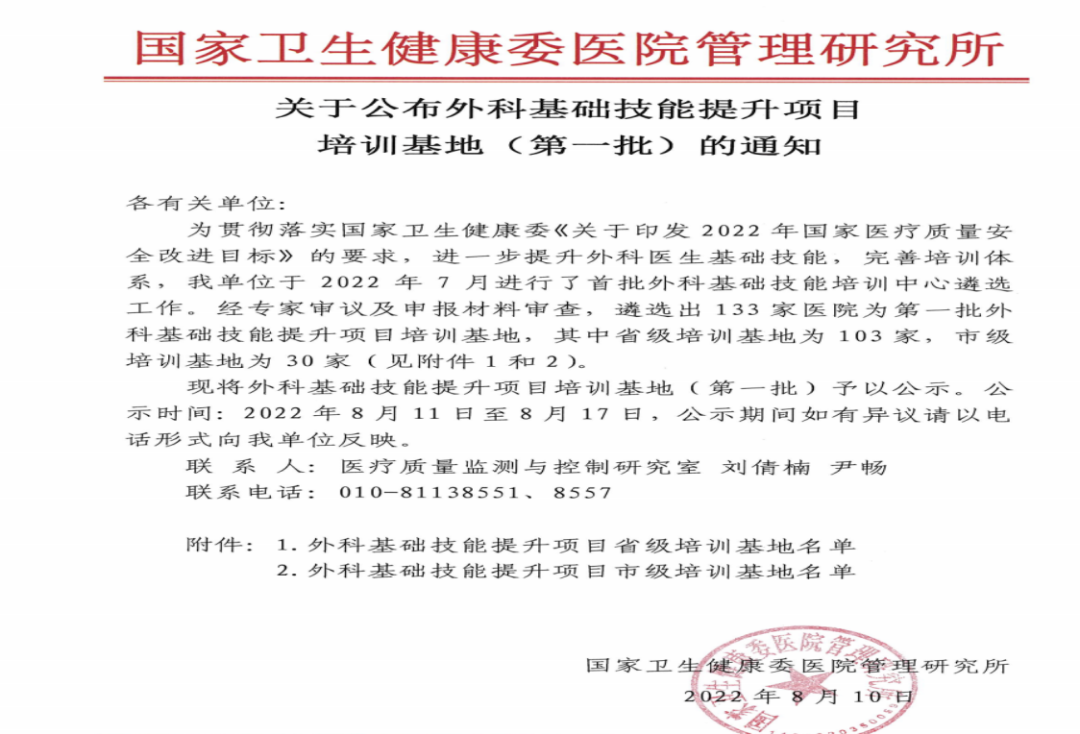国家卫生健康委医院管理研究所为贯彻落实国家卫生健康委《关于印发2022年国家医疗质量安全改进目标》的要求,进一步提升外科医生基础技能,完善培训体系,于2022年7月在全国范围内组织开展首批外科基础技能培训中心遴选工作。