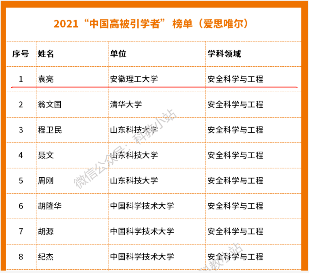 袁亮入选2021年“中国高被引学者”榜单