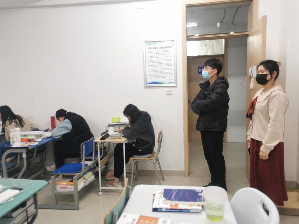 人文学院闪诚章在教室查看学生自习情况