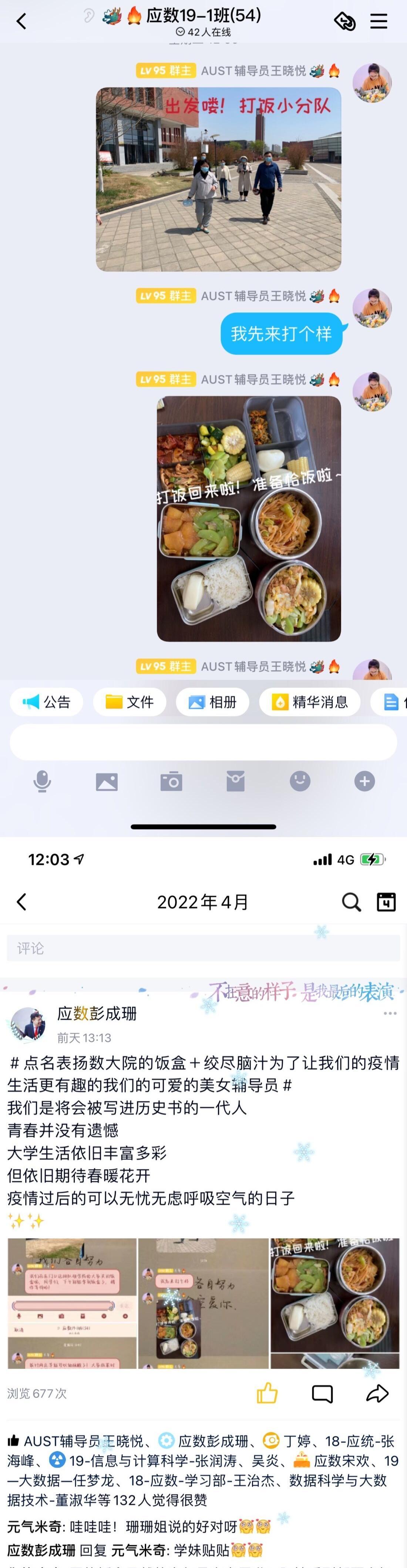 做学生成长的陪伴者,这是我一直坚持的信念。学校封闭10天了,封闭的校园生活让宿舍真正成为了同学们的学习之家、生活之家。如何丰富我们的生活,增添围墙之内的色彩呢?能做点什么让这个春天不一般呢?突发奇想的我,在群里晒了我和同事们的午餐,引发了同学们的热情回应,于是“晒午餐”成了学生们午间时分的线上快乐。大家畅所欲言,哪个食堂的饭菜好吃,哪个窗口的阿姨打菜手“最稳”。师生相约云端,线上交流,屏对屏、心连心,为同学们充分排遣了疫情带来的压抑心情。拍风景、跑宥马、看草长樱落……封闭不封心,宅寝不Emo,我相信疫情偷不走的美好一直在身边!