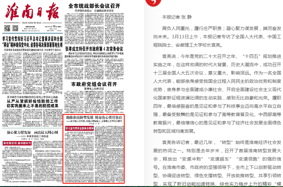 近日,根据中共安徽省委宣传部、中共淮南市委宣传部要求,《淮南日报》对全国人大代表、学校党委副书记、校长袁亮院士进行专访。采访内容刊登在《淮南日报》3月15日头版。