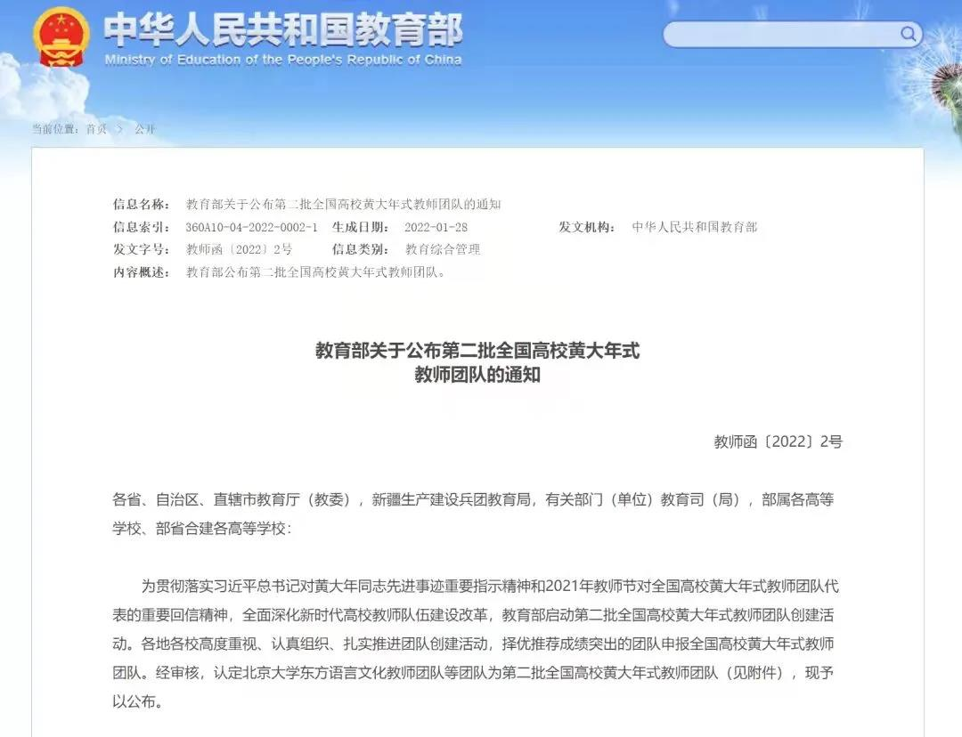 据悉,2017年,教育部印发《关于开展全国高校黄大年式教师团队创建活动的通知》,于2018年公布首批全国高校黄大年式教师团队。2021年教师节前夕,习近平总书记对全国高校黄大年式教师团队代表回信,肯定全国高校黄大年式教师团队的工作成绩,提出殷切期望。为贯彻习近平总书记对全国高校黄大年式教师团队代表的重要回信精神,教育部启动并认定第二批全国高校黄大年式教师团队创建活动,持续推进团队创建工作。