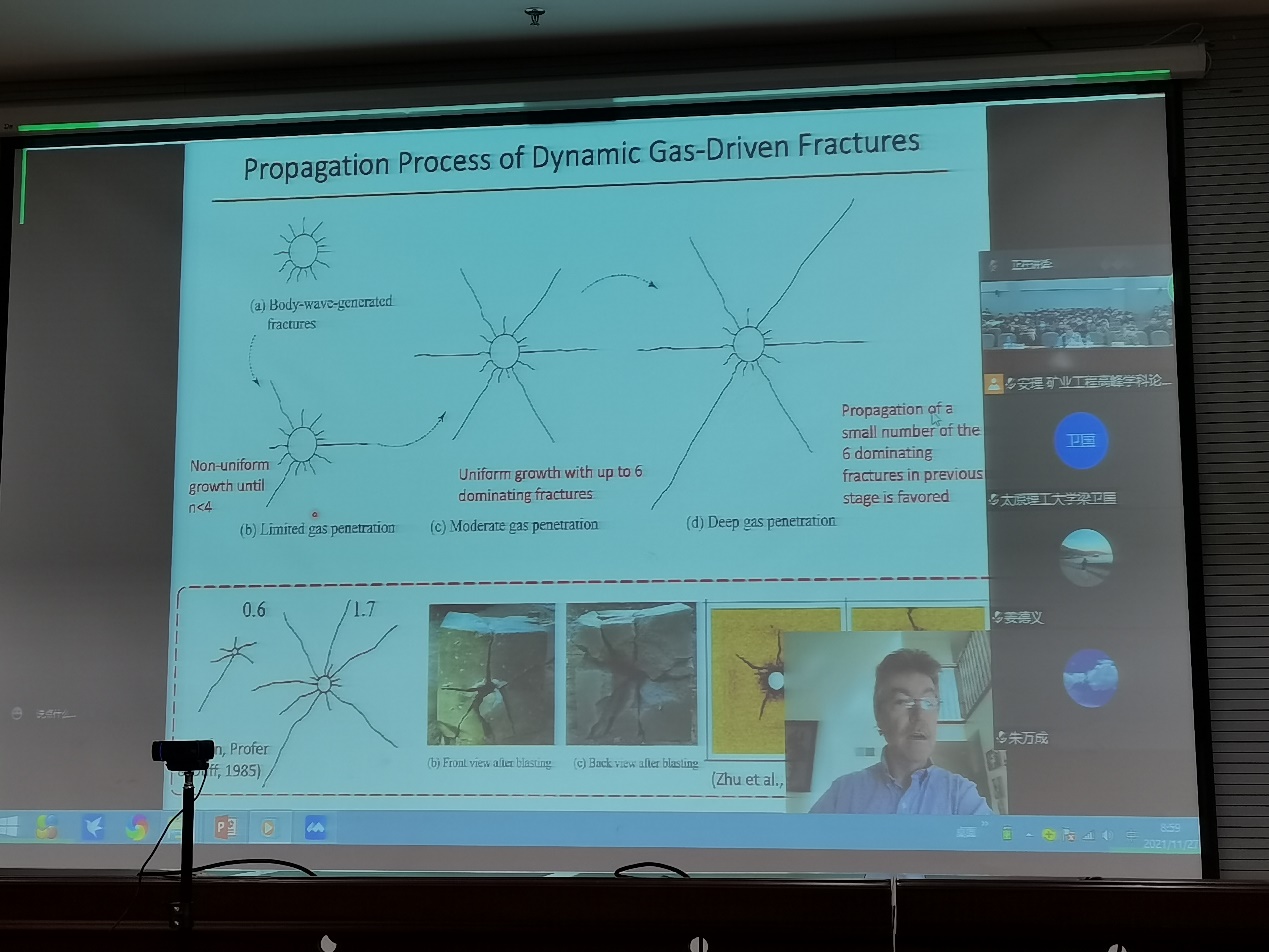 会议分两个阶段进行。第一阶段中,美国宾夕法尼亚州立大学Derek Elsworth院士、太原理工大学梁卫国教授、重庆大学姜德义教授、东北大学朱万成教授和昆士兰科技大学Yilin Gui博士等6位专家学者应邀作论坛主旨报告,共同围绕动态CO2压裂在防治超压瓦斯突出中的应用、非常规油气资源原位改性开采理论与技术、废弃盐矿溶腔大规模储能及其在双碳中的作用探索、金属矿山灾害风险监测预警云平台、考虑弹塑性和连续损伤效应的CO2注入过程中井筒稳定性分析等矿业工程热点问题和前沿技术进行了大会交流。报告内容丰富翔实、引人入胜,为参会师生呈现了精彩的矿业工程学科最新研究进展。
