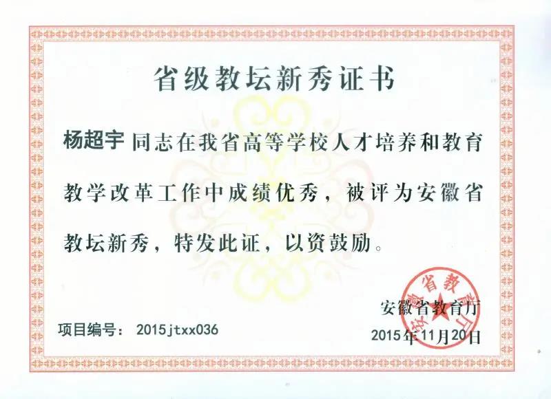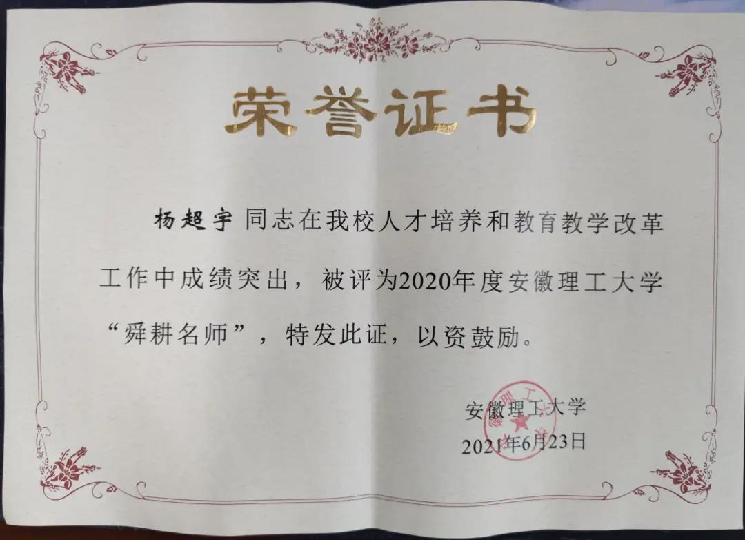 古人说:道虽迩,不行不至;事虽小,不做不成。17年深稽博考,杨超宇一直初心不改,以身作则,用行动去教育青年一代,胜过一切的华丽语言。杨超宇用务实和坚守,敬业与奉献,向着更高目标扬帆远航,以榜样的力量影响着身边的同事,用辛勤的汗水悉心刻画着安徽理工大学学生的未来,谱写着教育的赞歌。