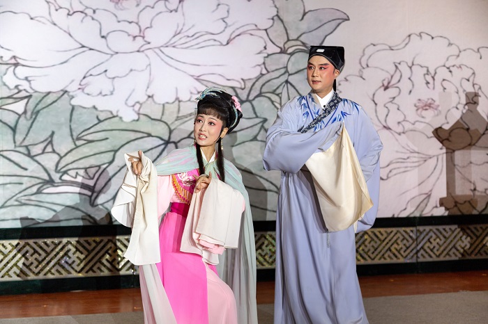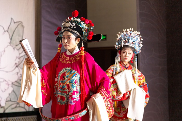 演出在清脆甜美的唱腔中拉开帷幕。国家一级演员马自俊、余淑华等著名演员轮番登场,向观众演绎了经典故事《女驸马》。黄梅戏《女驸马》讲述了民女冯素珍冒死救夫,经历了种种曲折,终于如愿以偿,成就了美满姻缘的故事。该剧通过女扮男装冒名赶考、偶中状元误招东床、洞房献智化险为夷等一系列近乎离奇却又在情理之中的戏剧情节,塑造了一个善良、勇敢、聪慧的古代少女形象。整场演出情感饱满,唱功精湛,掌声不断。