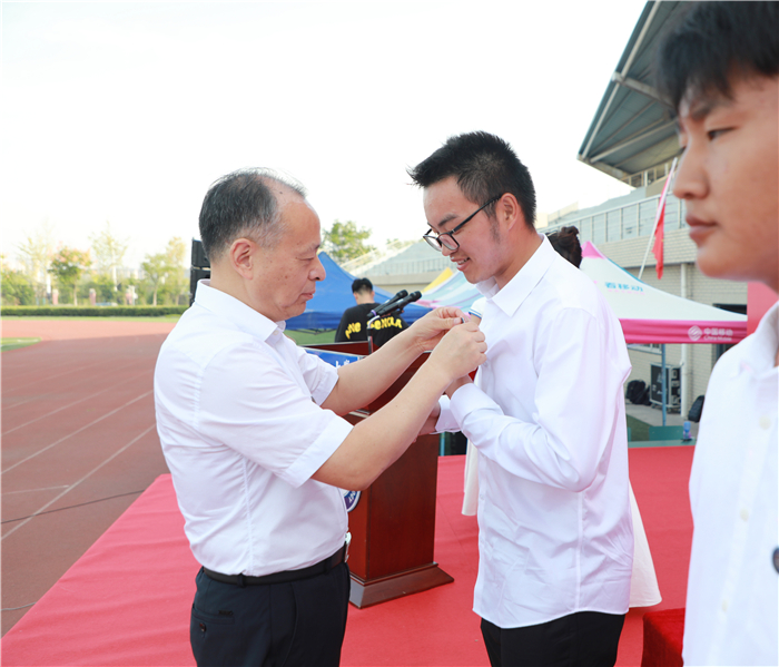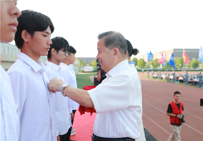 为新生代表佩戴校徽