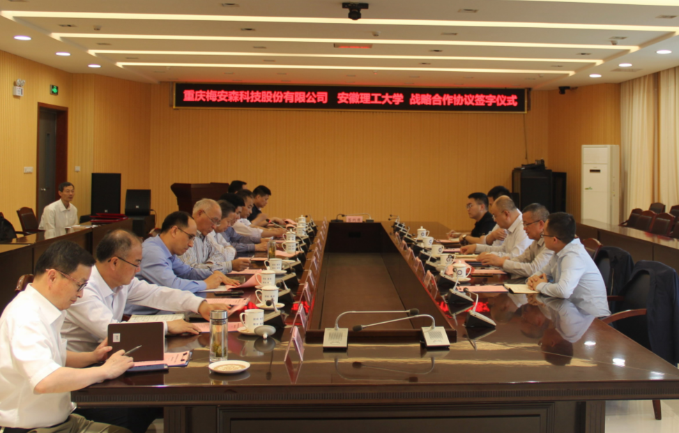 5月25日,学校与重庆梅安森科技股份有限公司校企战略合作协议签字仪式在舜耕苑二楼会议室举行。校党委副书记、校长袁亮院士,校党委副书记、常务副校长虞宝桃,校党委常委、副校长郑明东,重庆梅安森科技股份有限公司董事长马焰、总经理周和华等出席签字仪式。虞宝桃主持签字仪式。