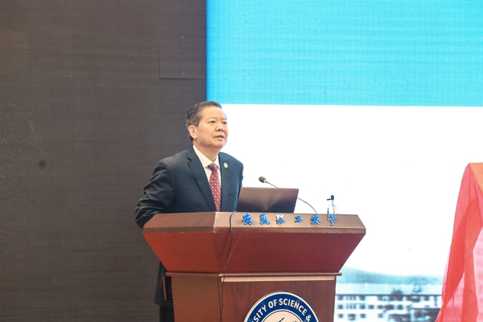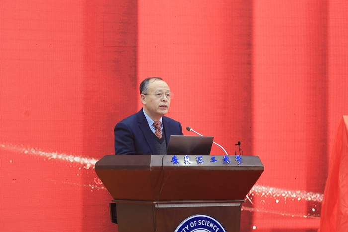 中国矿业大学副校长周福宝致辞,代表中国矿业大学和其他参会单位对学校两个学部、两个学院的成立揭牌表示热烈祝贺,对学校办学75年来取得的成就表示赞赏。周福宝强调,此次揭牌的四个学术机构,是安徽理工大学响应国家重大需求的战略举措,对深刻把握新一轮科技革命和产业变革带来的机遇,提升学科治理体系和治理能力现代化水平,推动世界一流学科和国内一流特色高水平大学创建具有十分重要的意义。他表示,中国矿业大学和安徽理工大学同为服务矿业尤其是煤炭行业高校,具有深厚的历史渊源,在携手书写矿业高等教育壮丽诗篇的办学进程中结下了深厚的友谊。希望今后两校进一步深化交流合作,互相学习借鉴,共同提升进步,并和高等院校、科研院所、企业单位协同创新,精诚合作,不忘初心,再谱新篇!祝愿安徽理工大学安全、矿业学科的发展越来越好,为服务国家能源资源战略和行业转型发展做出新的更大的贡献。