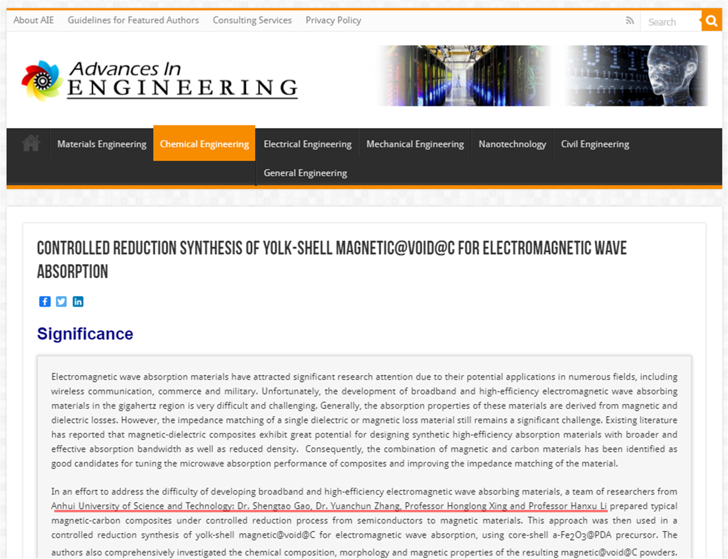 近日,我校高圣涛老师、张元春博士、邢宏龙教授、李寒旭教授等人发表在Chemical Engineering Journal(IF = 10.7,ESI工程学学科期刊,中科院一区Top期刊)上的学术论文《Controlled reduction synthesis of yolk-shell magnetic@void@C for electromagnetic wave absorption》被国际著名科技机构“工程进展”(Advances in Engineering, AIE)遴选为关键科学文章,并进行了重点报道。