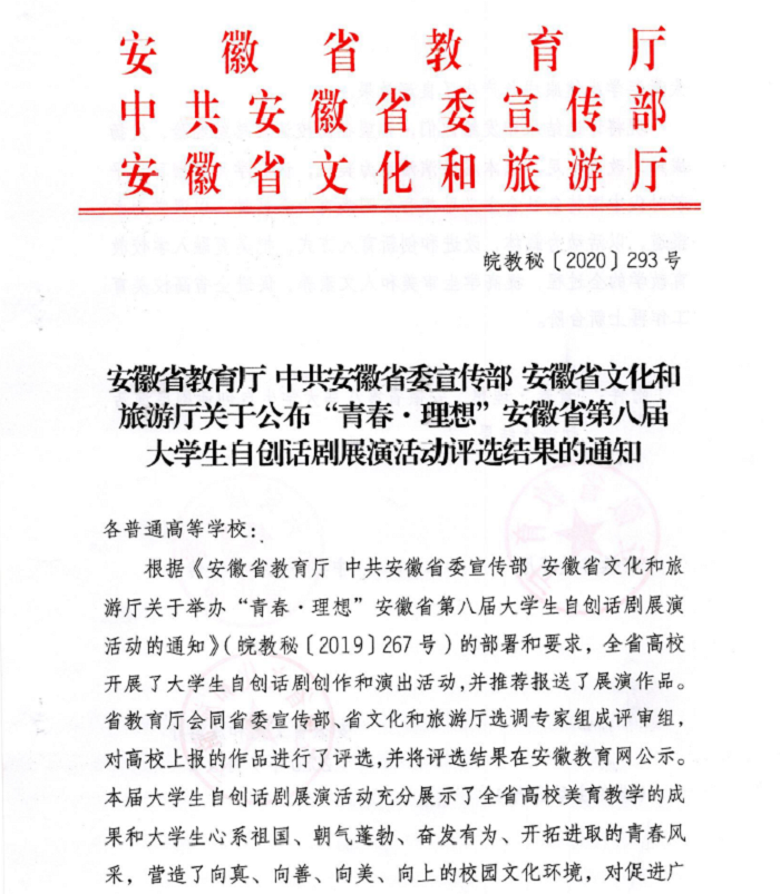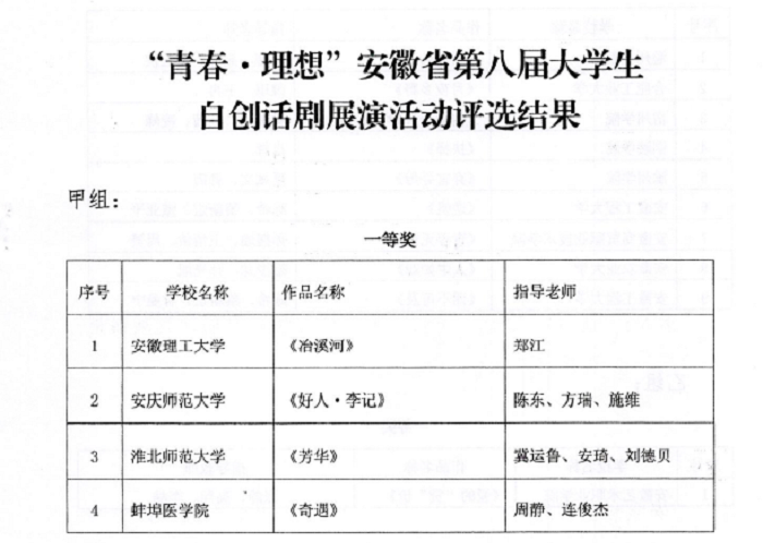 近日,由省教育厅、省委宣传部、省文化和旅游厅共同举办的“青春•理想”安徽省第八届大学生自创话剧展演活动评审结果正式揭晓,我校参评作品《冶溪河》获得甲组(非艺术类院校)一等奖(排名第一)。