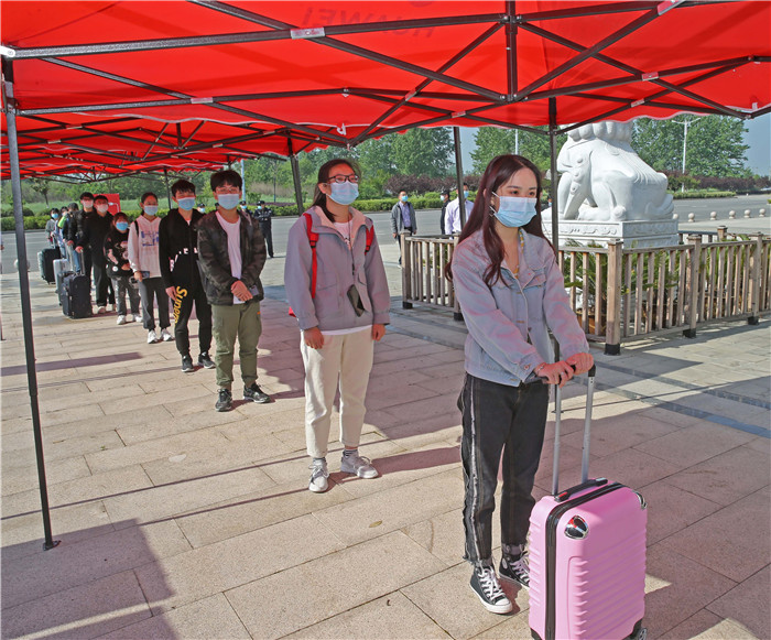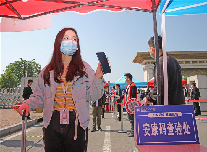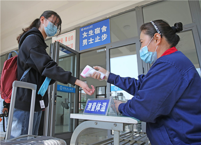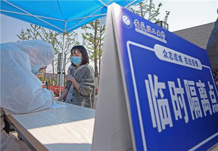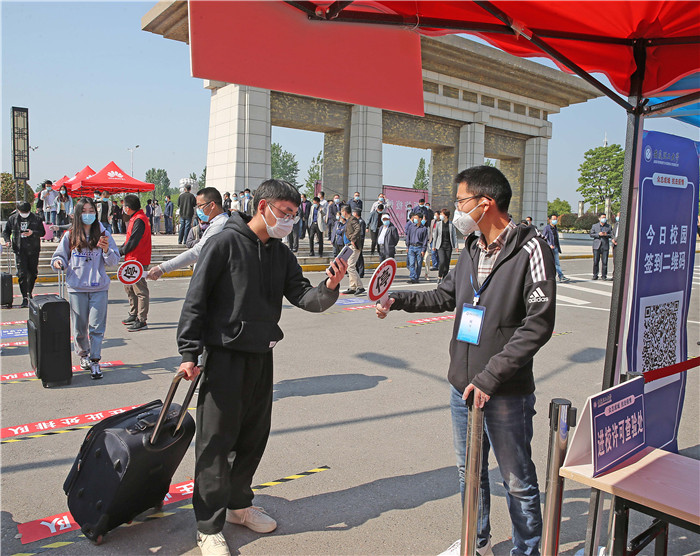 演练现场,返校学生佩戴口罩,到达校园南门,在候检区按照地贴位置间隔1米依次排队等候,在入校许可查验处,学生打开今日校园APP扫码签到,并出示签到码,扫码通过后,出示返校当日“安康码”进行核验,通过红外体温检测后,接受消毒,领取爱心包,更换口罩,在志愿者指引下到达宿舍楼,再次体温测量、身份核验无误后,进入宿舍入住。以上场景中,若学生体温检测或安康码核验异常,将由专人将其带至临时隔离观察点交给校医院医护人员进行应急处置,送往定点医院进行医学检查,对经定点医院检查诊断无需留下治疗或隔离观察的学生,送到校医院医学观察室进行医学观察。