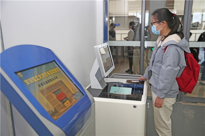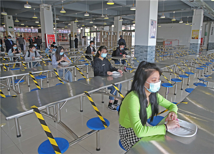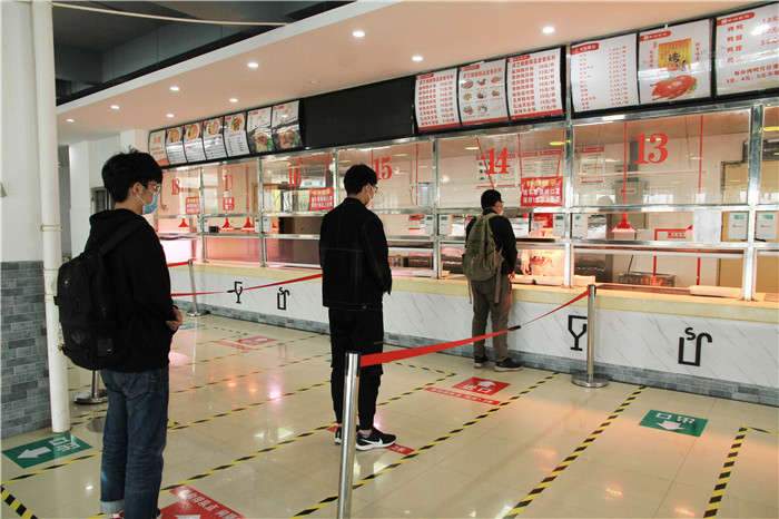 在仁苑学生食堂,学生佩戴口罩、自带餐具,经洗手、测温后有序从食堂南门进入,保持1米间距排队到窗口购买饭菜,按一人一桌同向而坐就餐,或购买饭菜后从食堂北门出口离开食堂回宿舍就餐。图书馆阅读学习模块对学生如何进入图书馆、借阅室内借阅书籍等进行了演练。
