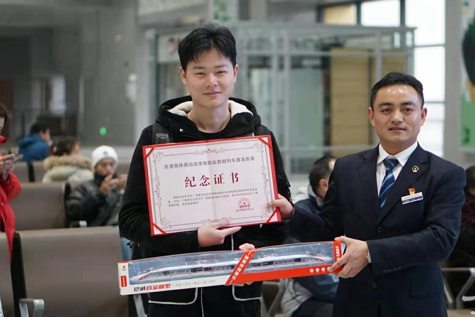 当日上午8时05分,京港高铁商合段首趟列车G7787次界首至上海虹桥高铁动车组列车准点驶进淮南南站,停留2分钟,于8点07分缓缓驶出,淮南南站安全有序迎送首批进出站旅客。我校大四学生章峰,幸运地成为淮南南站首趟列车的首名旅客。听说淮南南站开通了,他前一天特意在网上购买了去往合肥的高铁票,没想到居然成为首趟列车的首名旅客:“从学校到南站坐公交一站路就到了,到合肥也只要27分钟,真是太方便了!