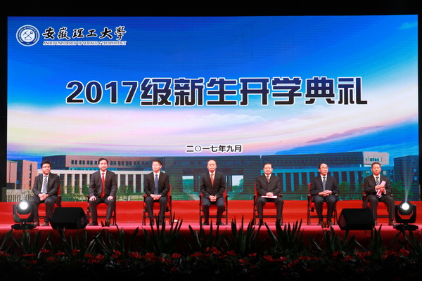 随着大屏幕上《安徽理工大学欢迎你》暖场视频播放完毕,校党委书记郭永存,校党委副书记、副校长袁亮院士,副校长孟祥瑞,校党委常委、副校长郑明东、吴照明、宫能平、董雨依次登台与亲爱的新生们见面。