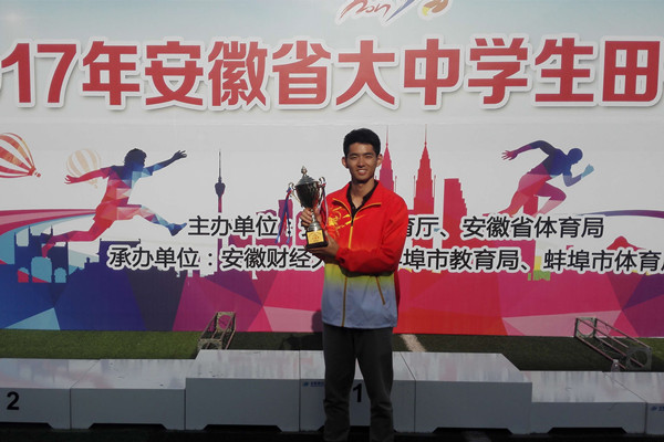 4月25日至29日,由安徽省教育厅、安徽省体育局主办的2017安徽省大学生田径运动会在安徽财经大学圆满结束。我校田径队队员克服了训练时间短和伤病等困难,奋勇拼搏,最终获得一等奖2项、二等奖5项、三等奖9项,男子甲组团体总分第二的优异成绩。其中,来自机械工程学院的王健同学以15.62秒的优异成绩打破安徽省大学生男子组110米栏15.92秒记录,获得金牌,这一纪录也使我校在安徽省大学生田径记录中的项目数上升达到4项。
