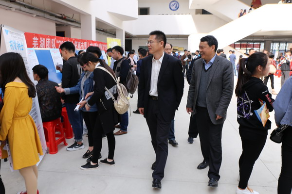 招聘会期间,校纪委书记周峰亲临现场指导工作,看望了淮南市市委组织部副部长岳文贵、人社局副局长李文生等合肥、淮南、六安、滁州、芜湖、马鞍山、桐城七市的市委组织部、人社局、人才办及用人单位代表,并组织与会领导参观了学校新校区和学生创业成果展等。
