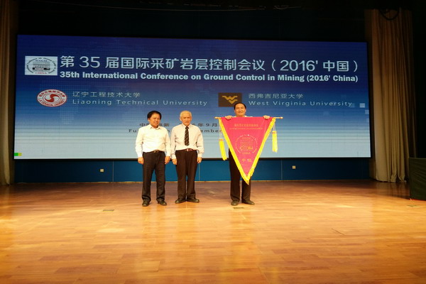在9月18日至19日召开的由辽宁工程技术大学、美国西弗吉尼亚大学及中国国家自然科学基金委等单位共同主办的第35届国际采矿岩层控制会议(中国)上,我校经过激烈竞争,成功获得第36届国际采矿岩层控制会议(中国)主办权。在会议(中国)闭幕式上,举行了大会会旗交接仪式。华心祝教授代表学校接过大会会旗并讲话。