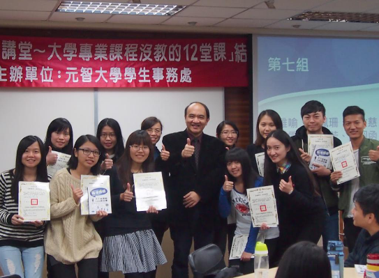 元智大学还有很多非常有特色的课。比如我在交换期间参加了一个培训“大学专业没教的12堂课”,并且得到了元智大学校长亲手颁发的结业证书。这12堂课分别从团队合作、问题解决、企划能力、国际宏观、职场认知、工作态度、职场伦理、简报能力、职场趋势、沟通能力、英文求职和职场礼仪对参训学生进行教导和训练,培养学生提前研习管理要义,以便今后在职场中脱颖而出,逐步成为具有全球流通力(Global Mobility)的优秀人才。
