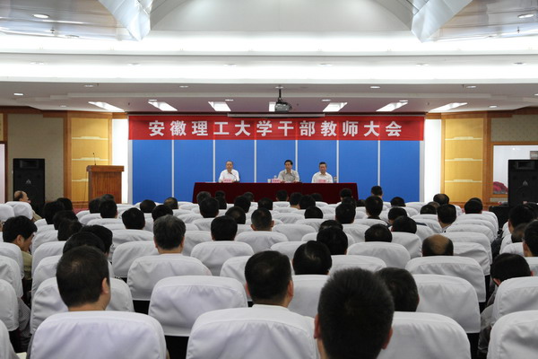 5月17日下午,省委第十九考核组在校本部九楼报告厅召开干部教师大会,反馈学校领导班子2015年度综合考核结果。组长、省人大人事代表选举委员会副主任委员、省人大常委会人事代表选举工委副主任刘振新,副组长、省委教育工委副书记江春等考核组一行到校反馈,宣布我校领导班子综合考核为“优秀”等次。会议由校党委副书记、校长郭永存主持。校领导叶醒狮、王洪、王其东、孟祥瑞、周峰出席会议。