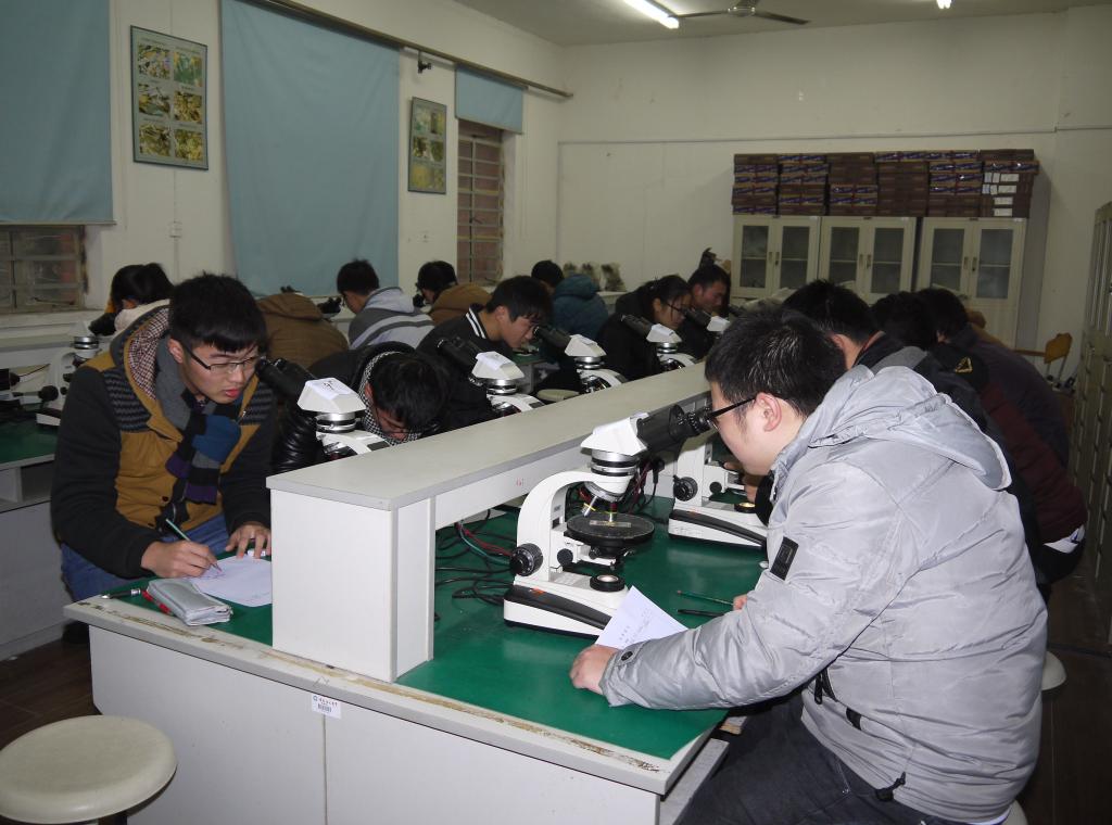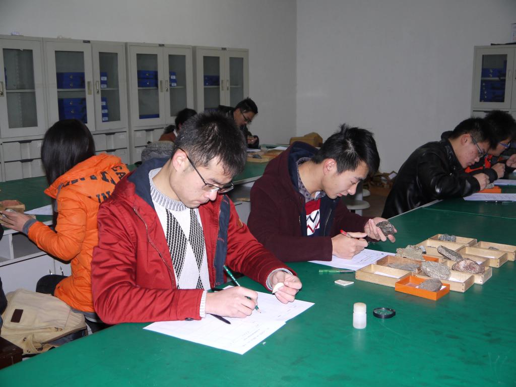 大赛分为笔试和标本鉴定两个阶段。笔试阶段,参赛同学沉着冷静,认真答卷,都争取在考试中发挥自己的实力。标本鉴定阶段,在地质楼实验室,参赛选手仔细辨认各类岩石、矿石、化石的手标本和薄片、光片,展示了熟练的地质技能。