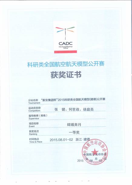 由国家体育总局、中国航空运动协会、“科研类”飞行器设计挑战赛组织委会联合主办的科研类全国航空航天模型锦标赛分站赛八月初在杭州建德举行。经过激烈角逐,我校大学生航模协会队员奋力拼搏,在“嫦娥奔月”项目中取得了单次放飞第二的好成绩,获得了该项目竞赛的一等奖,并入围全国锦标赛,同时还获得6个免费参赛指标。