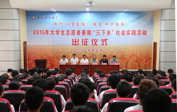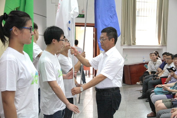校党委书记颜事龙宣布安徽理工大学2015年暑期“三下乡”社会实践服务团队出征。颜事龙、叶醒狮分别为国家级、省级和校级重点团队授旗。