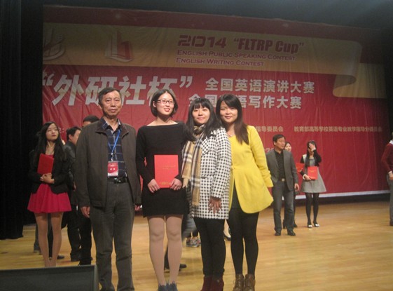 11月1日-2日,2014“外研社杯”全国英语演讲大赛安徽省复赛在安徽财经大学隆重举行,来自全省各高校的80余名优秀选手参加了比赛。经过激烈角逐,我校外国语学院2011级英语专业古雪茹同学在院长束学军、英语系系主任雷鹏飞的带领下,发挥出色,荣获一等奖(在全省参赛选手中成绩排名第2),创我校历年来此项赛事的最好成绩,并将代表安徽省参加于12月7-12日在北京举行的2014“外研社杯”英语演讲大赛全国总决赛。另外,我校指导教师程仲荣获大赛指导教师类一等奖。
