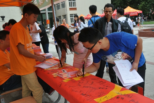 贷款新生在诚信承诺宣传横幅上签名