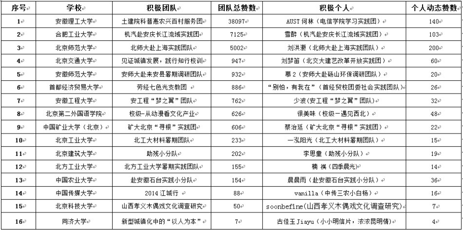 日前,从团中央网络影视中心获悉,土木建筑学院“科普惠农兴百村”2014年大学生暑期社会实践服务团以350条实践动态发布量、2852人次关注访问量以及近4万次总点赞数的优异表现被评为“Myouth暑期社会实践分享活动全国最积极团队”。此外,我校电气与信息工程学院何林同学也在本次分享活动中被评为“积极个人”。