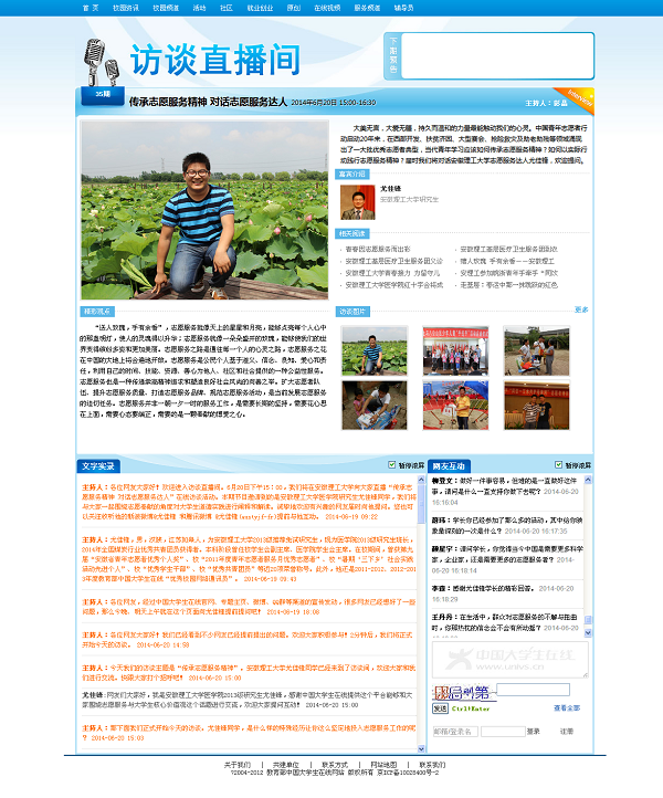 6月20日15:00-16:30,为了配合“全国大学生道德实践成果网络巡礼活动”,推动形成大学生爱学习、爱劳动、爱祖国的有效形式,凝聚形成奋发向上、崇德向善的校园力量,营造积极健康的高校网络育人氛围,教育部中国大学生在线“访谈直播间”邀请我校医学院2013级研究生尤佳锋同学作为道德事迹人物与全国网友进行在线交流,讲述他对志愿奉献道德实践的感悟。“访谈直播间”网址:http://uzone.univs.cn/talk/35_aust/