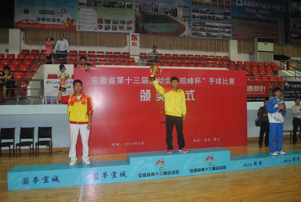5月10日上午,安徽省十三届运动会高校部手球比赛在安庆市潜山县体育馆拉开战幕。共有来自省内12所高校19支代表队、300余名运动员参加了比赛。经过5天39场的激烈角逐,我校男、女手球队分别荣获男子甲组冠军,女子甲组亚军的好成绩,为学校争得了荣誉,扩大了影响,提高了我校的知名度。同时,我校代表队杨帆、赵东、马瑶和陈晨还获得了大赛优秀运动员的荣誉称号。