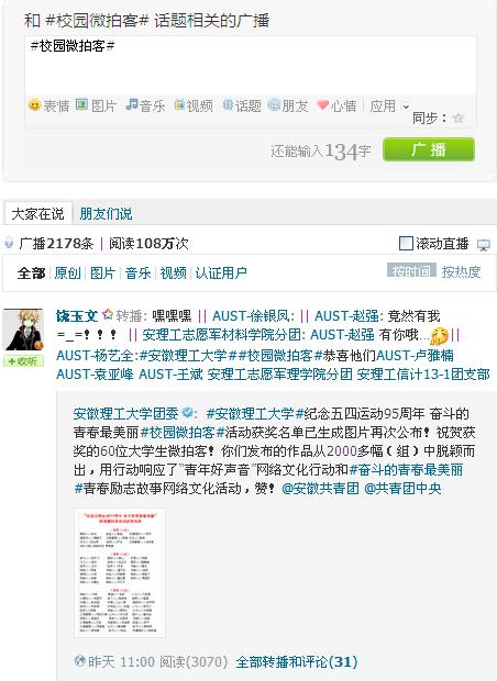 5月12日,由安徽理工大学团委、学生会、大学生社团联合会主办的“纪念五四运动95周年 奋斗的青春最美丽”校园微拍客活动圆满结束。经校内外专家评审,60名大学生微拍客围绕“最美校园风景”、“最美校园人物”、“最美校园故事”和“身边的好青年”四个方面创作的微博、微电影获得了本次活动的一、二、三等奖。
