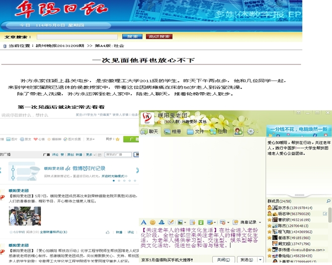 随着经济社会的发展,我国人口老龄化速度加快、程度加重,老年人特别是有困难的老人生活及心理状况越来越引起社会各界的关注。国家号召“社会各界要积极参与老龄事业的发展,关注、关心老龄事业,关爱、帮助广大老年人,共同营造全社会尊老、敬老、爱老、助老的良好社会氛围,共同承担起发展老龄事业的社会责任。”在这样的背景下,化学工程学院结合自身任务与条件,多次联合社区居委会,开展关爱困难老人的实践活动。2011年冬,学院领导带领帮扶小组,走进安徽理工大学社区组织看望、帮扶老教师。当时2011级弹药专业的孙方永同学也在帮扶小组之中。之后,他们来到侯波老师的家,在这个家里,一家四口却因三人患有先天性遗传病而瘫痪在床,而唯一能够自由活动的仅是这位80多岁老奶奶。看到这样困难一家,孙方永当即向学院领导请缨,留下自己的联系方式,希望可以尽自己所能长期帮扶这个家。这次的帮扶活动让孙方永与这个家庭结下了不解之缘,也为暖阳爱老团的成立打下了基础。